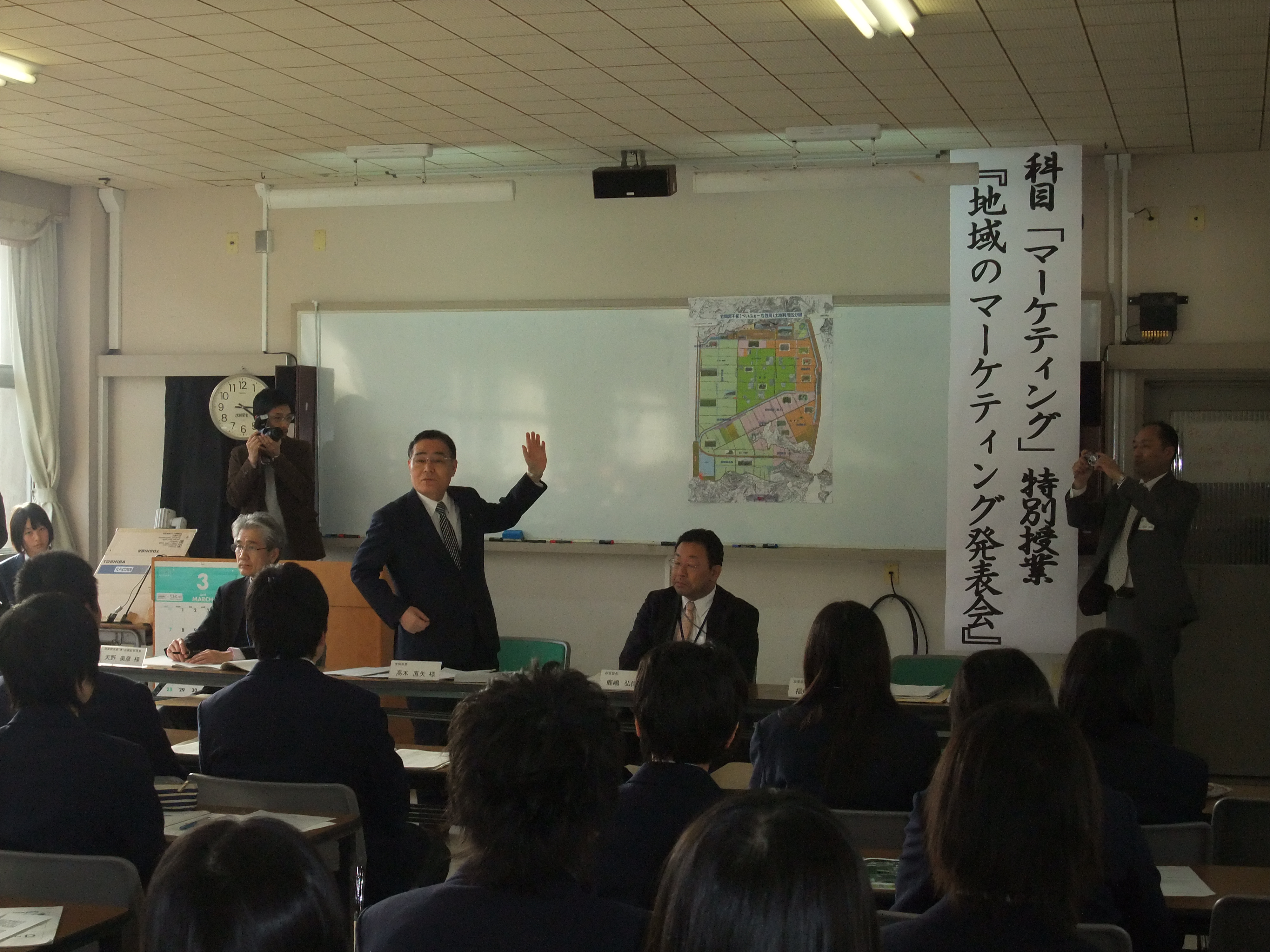 2月18日(水)・2月24日(水)の市議会の方々の講話や市役所職員の講話、グループ討議を踏まえて、わがまち 笠岡市の活性化について 『私たちが市長だったら どのような地域のマーケティング・マネジメントを行うか』 について笠岡市長はじめ市議会の方々などを学校にお招きしてプレゼンテーションを行う予定。