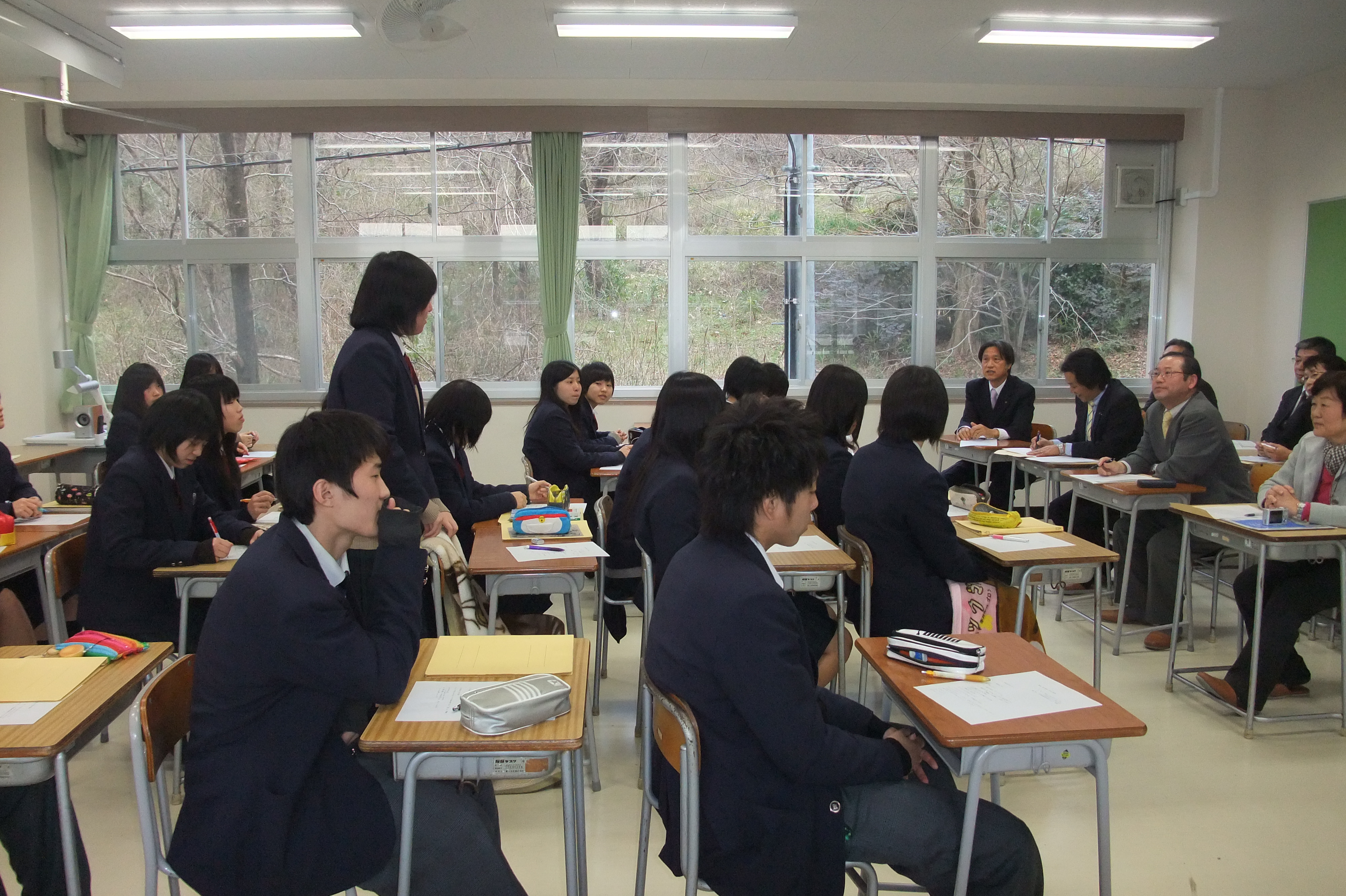 2月18日(木),2年B組(22名)の3校時(10:50~11:40)科目「マーケティング」(選択科目)に市議会の方々が11名来校し、『笠岡市の現状と未来について』とそれに関わって『地方議会と市民の関係について』ご講話を頂きました。